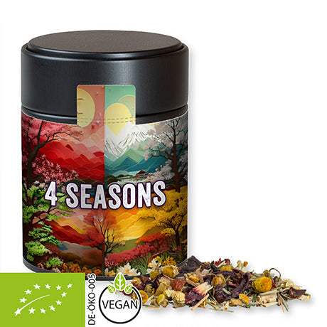 Deze biologische kruidenthee ‘Vierjahreszeiten’ is een heerlijke allrounder voor lente, zomer, herfst én winter. De mix van o.a. citroengras, hibiscus, kamille en munt zorgt voor een harmonieuze smaak, verpakt in een stijlvol zwart blikje met jouw eigen ontwerp.