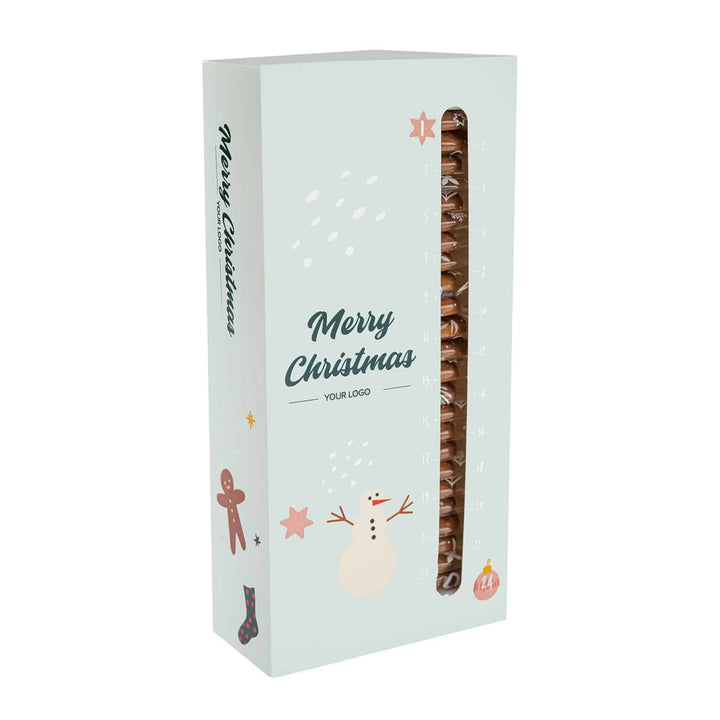 De toren is gevuld met knapperige karamel-kruidkoekjes die een warme, winterse smaakbeleving bieden. Dankzij het slimme ontwerp kun je elke dag een koekje eruit schuiven, wat zorgt voor een speelse en gezellige adventservaring. De verpakking kan volledig gepersonaliseerd worden met jouw logo, tekst of ontwerp door middel van digitale bedrukking, zodat het perfect aansluit bij jouw merk of kerstcampagne.
