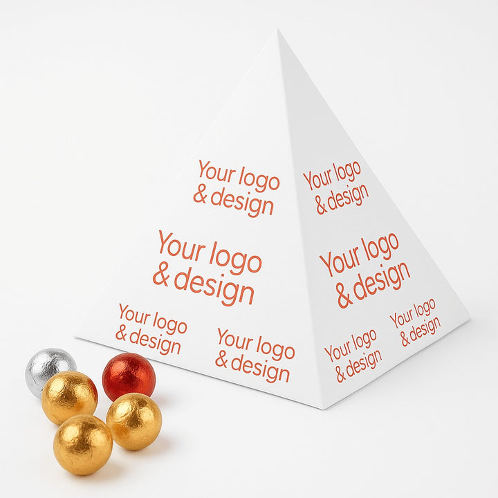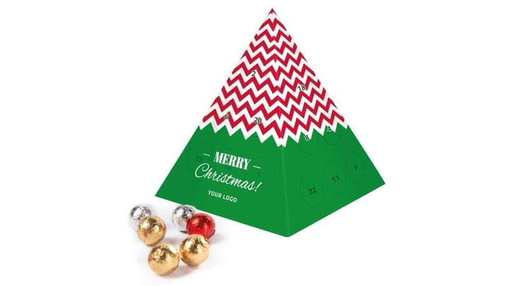 De piramidevorm kan volledig worden gepersonaliseerd met jouw logo en ontwerp, waardoor elke adventskalender een uniek en herkenbaar geschenk wordt dat perfect aansluit bij jouw merkidentiteit.