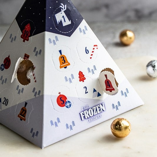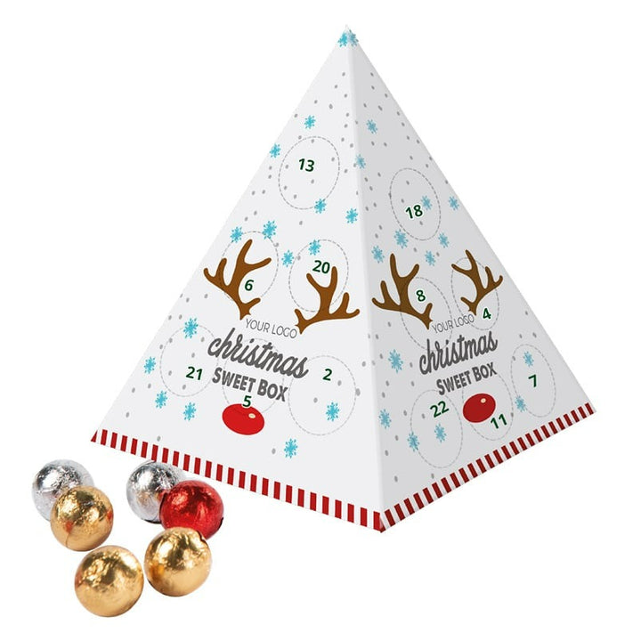 Maak van het aftellen naar Kerstmis een bijzondere ervaring met de Adventskalender Pyramide – een verfijnd en origineel geschenk dat elke dag een moment van plezier brengt. Deze moderne adventskalender bevat 24 heerlijke chocoladekogels (totaal 135 g), elk individueel verpakt in glanzend gekleurde folie.