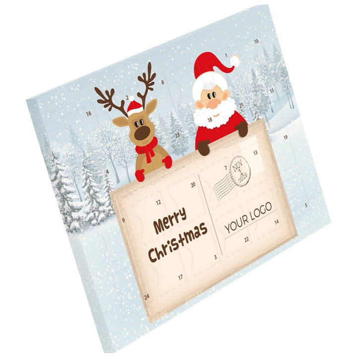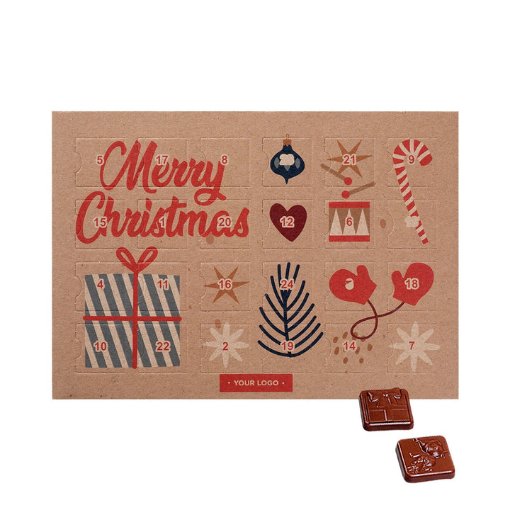 De Adventskalender XS brengt elke dag een glimlach met zich mee. Achter elk van de 24 vakjes schuilt een heerlijke melkchocolade van in totaal 50 g (33% cacao) – een perfecte manier om de dagen tot Kerst te tellen. Deze compacte en stijlvolle kalender is een geliefd kerstgeschenk voor klanten, medewerkers of relaties.