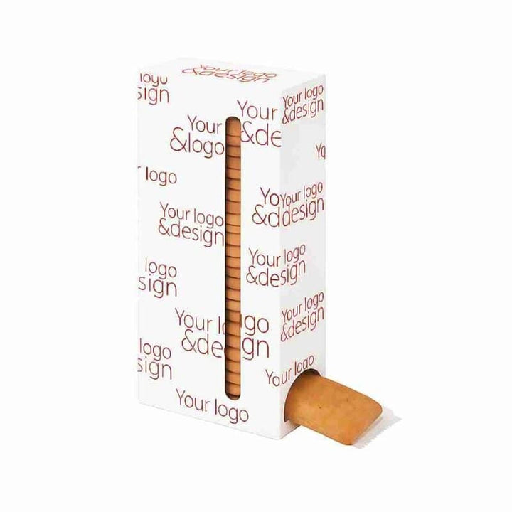 De kalender is gemaakt van 100% biologisch afbreekbaar karton met 100% composteerbare folie rond de koekjes. Standaard wordt hij geleverd in wit papier, met optioneel kraft papier voor een natuurlijke, eco-look. Dankzij digitale druk komt jouw ontwerp haarscherp naar voren – ideaal voor productintroducties, eindejaarsacties of jubileumcampagnes. Let op: door de natuur van de koekjes kan er tijdens transport wat kruimelvorming ontstaan, wat de smaakbeleving natuurlijk niet minder maakt.