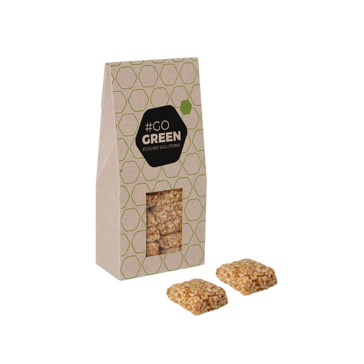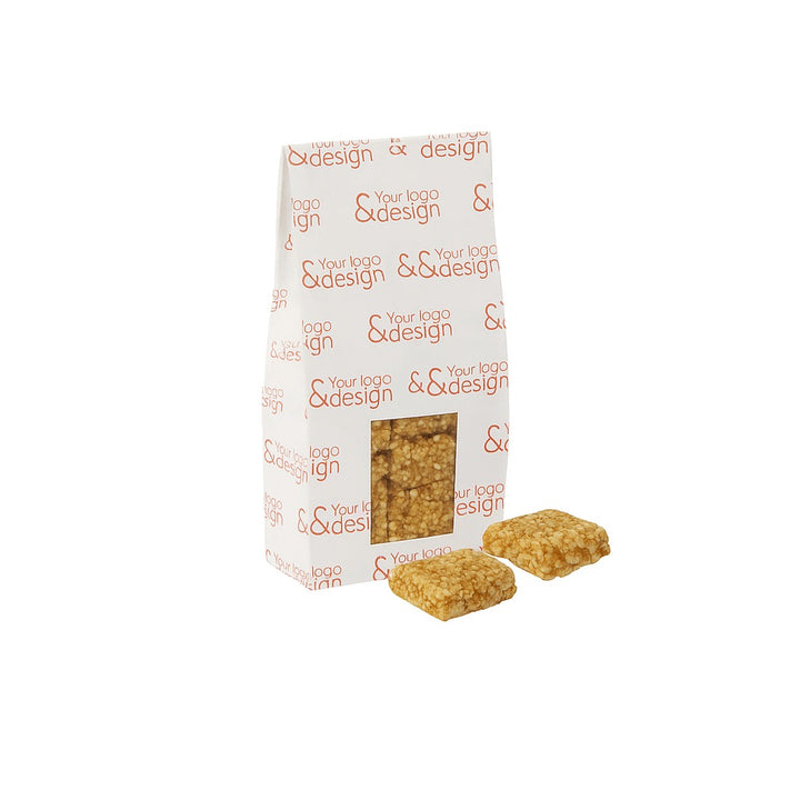 De Sesame Delight 30 g is een elegante variant op de klassieke sesam-snoepjes: knapperige blokjes vol geroosterde sesamzaadjes, handig verpakt in een stijlvolle sta-zak met venster. Ideaal als gezonde giveaway, toevoeging aan een goodiebag of als klein bedankje bij koffie of thee. De verfijnde uitstraling maakt dat jouw merk meteen geassocieerd wordt met kwaliteit en zorg.