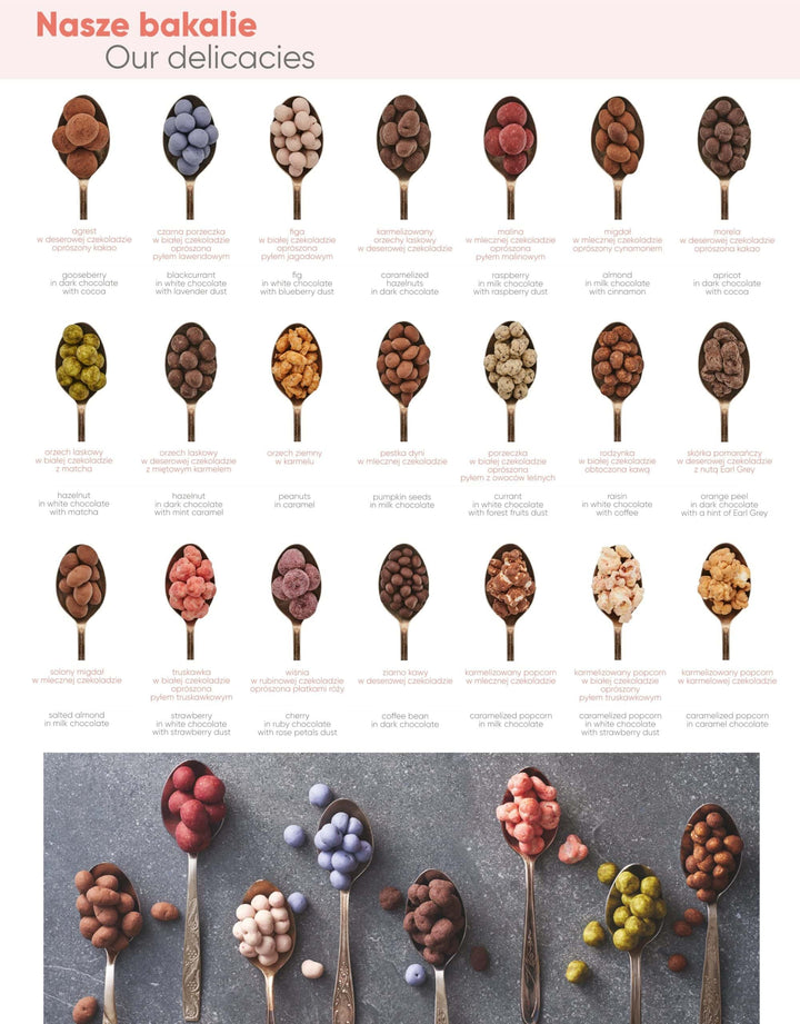2nd GROUP: caramelized hazelnuts in dark chocolate and cocoa, raisins in white chocolate and coffee powder, almonds in milk chocolate and cinnamon,roasted pumpkin seeds in milk chocolate, hazelnuts in white chocolate and matcha tea, salted almonds in milk chocolate | 3rd GROUP: figues in white chocolate and forest fruit powder, black currant in white chocolate with lavender or forest fruit powder at your choice |
