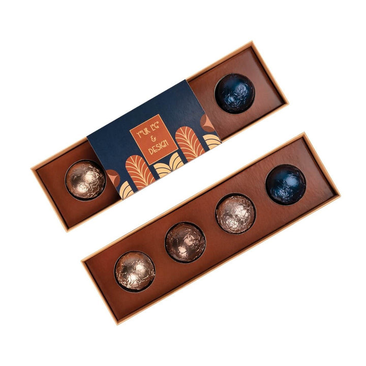 Er was eens een lang, stijlvol doosje dat vier schitterende chocoladepralines in zich droeg. Vier ronde Sweet Sphere pralines, zorgvuldig verpakt in glanzende folie, elk met een eigen zachte vulling en karakter. Dit doosje was een klein moment van luxe, ideaal om iemand te verrassen, te bedanken of te verwennen.