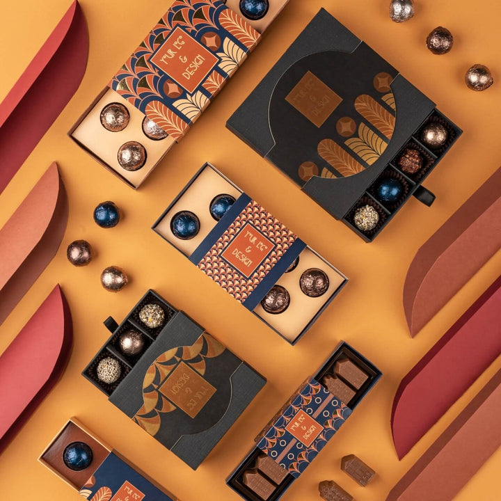De set bevat vier pralines (totaal 48 g) in de smaken hazelnoot, walnoot, amandel en pistache. Het doosje is standaard voorzien van een wit papieren wikkel, maar kan ook worden uitgevoerd in kraft of ecru papier met grass fibers voor een natuurlijke uitstraling.