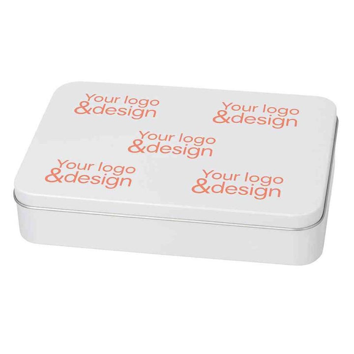 De buitenkant van het blik werd jouw speelveld: kies voor een full-colour digitale bedrukking rechtstreeks op het blik of voor een label in wit of kraft papier. Het elegante formaat van 190 x 130 x 35 mm maakt het blik ideaal om te overhandigen bij afspraken, als premium eindejaarsgeschenk of in een luxe giftbox.
