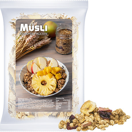 Maxi-Tüte aus transparenter Folie. Werbeanbringung als Etikett in 4c individuell bedruckbar. Zutaten Müsli Knusper Früchte: Vollkornhaferflocken 44,5%, Mehl (Gerste, Mais), Maisgrieß 1,5%, Fruchtmischung 20% in verschiedenen Anteilen [Rosinen, Bananenchips (Banane, Kokosöl,...